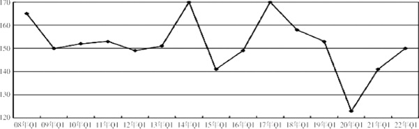 一季度安防企业盈利景气指数为122,位于"较景气区间"(见图8),与上季度相比下降了12个百分点,与去年同期相比下降了10个百分点。在调查对象中,有40%的企业反映"增盈(或减亏)",比去年同期下降了4个百分点;有42%的企业反映"持平",比去年同期下降了2个百分点;有18%的企业反映"盈利减少(或增亏)",比去年同期上升了6个百分点。