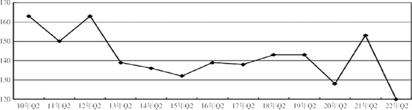 2022年二季度,外贸出口景气指数为100,与上季度持平,与去年同期相比下降了15个百分点,位于"微景气区间"(见图16)。其中,有32%的调查企业国外订单有了新的增长,比上季度上升了5个百分点;有36%的企业反映销售"持平",比上季度下降了10个百分点;有32%的企业反映"下降",比上季度上升了5个百分点。